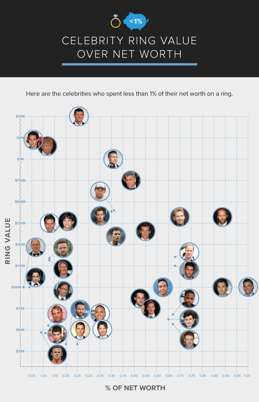 If you are looking for a comparative metric for your own impending nuptials, the average net worth spent on an engagement ring for celebrities was 15%. Going back to the average U.S. salary that’s a pretty hefty $7k.