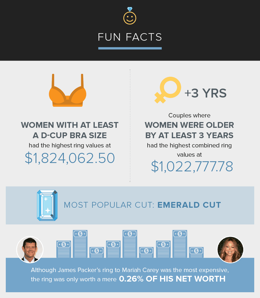 Studies show that larger physical assets lead to larger financial ones. Celebrity brides-to-be that maxed out at at a D-cup or more averaged promissory rings of over $1.8 million (significantly grander than average) — though whether those particular attributes began at their current size or were artificially augmented for the desired effect will require some additional research.