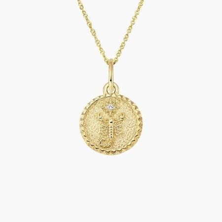 Scorpio medallion with a small diamond accent. One side has the scorpion embossed, the other side shows the zodiac symbol. Comes on an adjustable cable chain (16-18 inches)