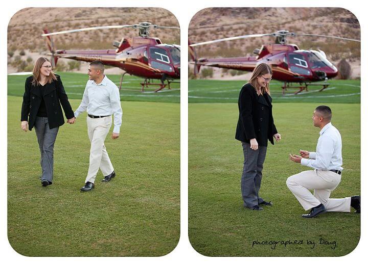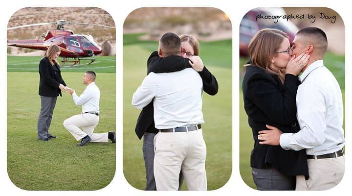 The Heart Bandits are excited to share with you a Las Vegas proposal that we planned. Abe from Sacramento, CA wanted his proposal to be perfect! He wanted to propose in Las Vegas and he wanted it to be big. Abe and The Heart Bandits came up with the perfect marriage proposal idea. We send a limo to pick up Lindsey and Abe from their hotel. The limo transports the couple to a helipad where they are whisked away on a helicopter. The helicopter flies over a golf course but suddenly, it begins descending. Upon decent, Lindsey reads a huge banner that says “Lindsey, Will You Marry Me?” The helicopter lands and Abe gets on one knee and proposes. The two celebrate at a romantic table for two with champagne before they re-board the helicopter for a private tour of the Vegas strip. Check out the pictures of this romantic proposal provided by Mindy Bean Photography.