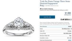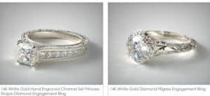 I’m attempting to narrow it down. I found the most options through James Allen and have picked two that I really like. I don’t have a gold or platinum preference, the gold just happened to be what came up. The second option may not be a contender because the write up shows that it has to be round and the max stone size is 1.5. If that’s correct, and those points are flexible, then we go for the first because I don’t want round.