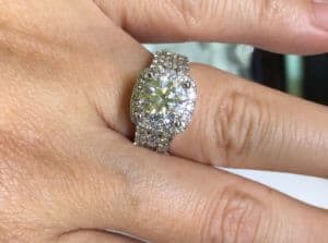 It looks beautiful, but for that type of setting, for sure I wouldn’t go lower than an H. Lower colors might have a strong yellowish tinge compared to the smaller diamonds around the center stone.