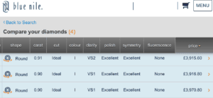 Problem is, I’ve plugged that into a Blue Nile and James Allen and it’s returned hundreds of diamonds. I’ve tried to run through them and make some judgements, but feel that at this point I need some expert advise to find the ‘right’ diamond. Otherwise, I’ll just end up going for the ‘bigger is better’ approach, which I think could be a mistake. From my search I do feel like a sweet spot could be around 0.95-0.99 carat. It’s clear from James Allen I won’t get over 1ct that’s higher than SI2 or H for £4,000 or under.