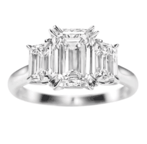I am looking for a three-stone emerald cut diamond engagement ring, center stone to be between 2.0 – 2.5ct + with side stones most complimentary to the center. My budget is approximately $15-18K, but there is some flexibility there if we decide it is absolutely necessary. I tend toward a platinum setting (single prong or claw?) and am leaning toward emerald or trapezoid for the side stones. Images of rings I have found and liked during my search include: