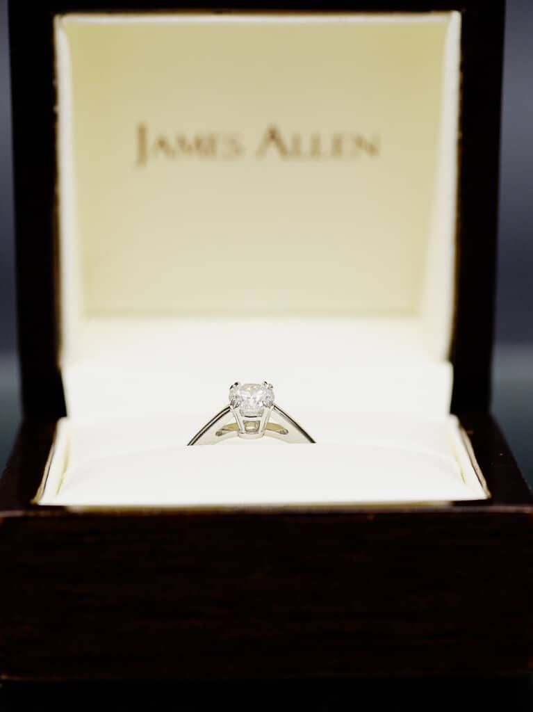 This diamond is bright, eye-clean and a great value. I figured I’d recommend an H+ center diamond in case she wants to go for a pave setting later on (or match it up with a pave wedding band). You are getting a fantastic ring on the low end of your budget that satisfies her desires. Looks like a winner to me. What do you think?