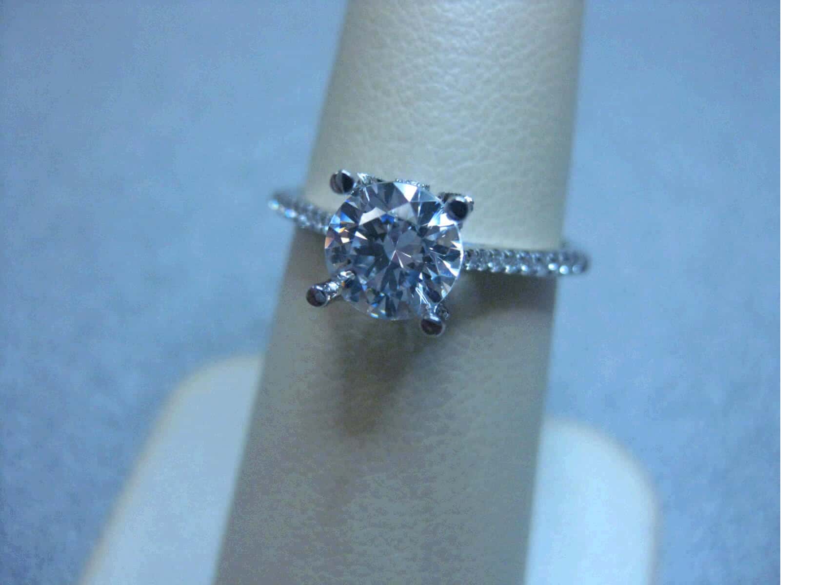 The ring I am considering is a platinum ring with one main stop and diamonds along the band (I think it goes 3/4 the way around) and another small diamond on the front and back of the area that holds the main stone. I think there’s 22 total.