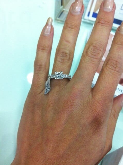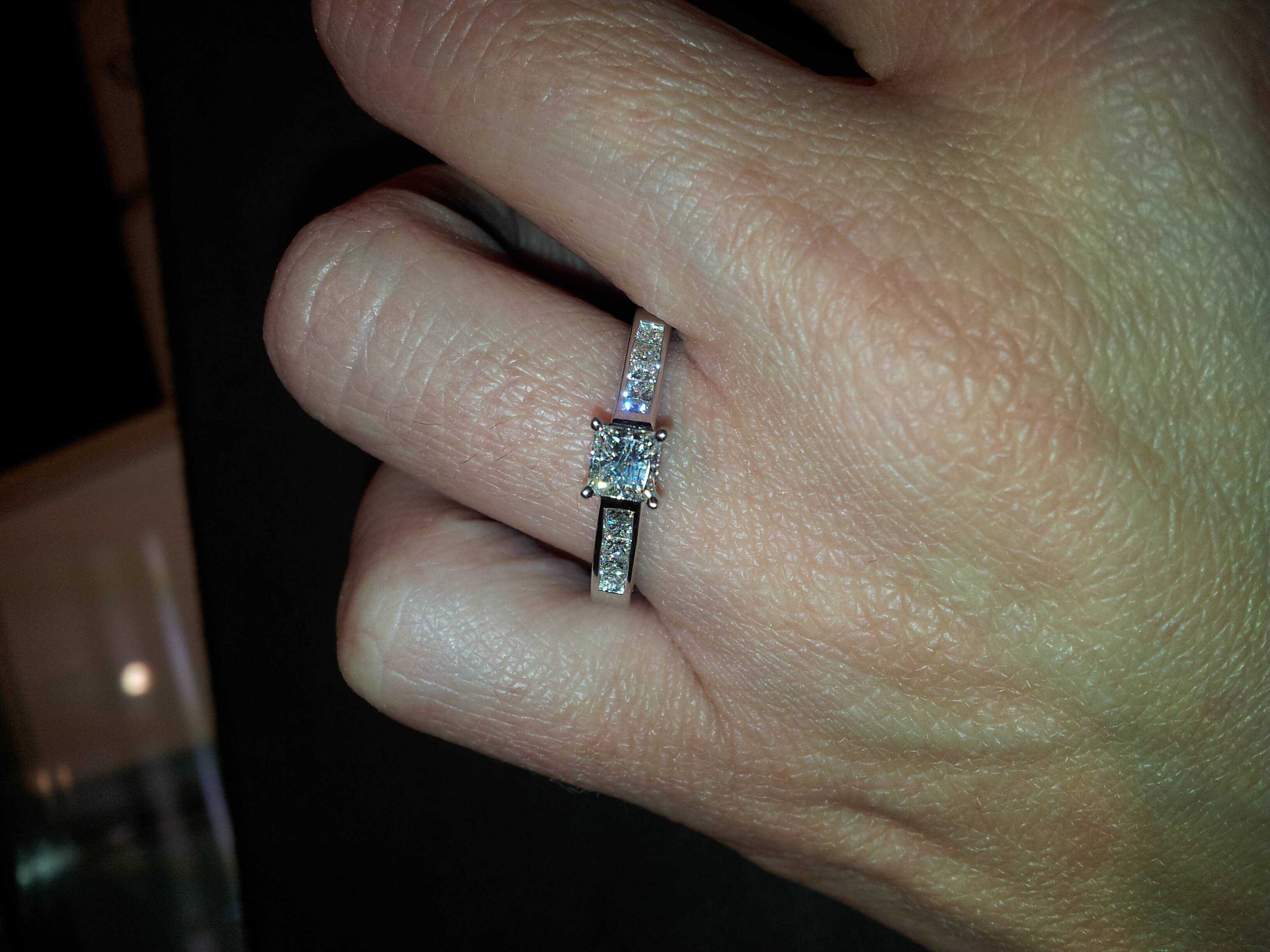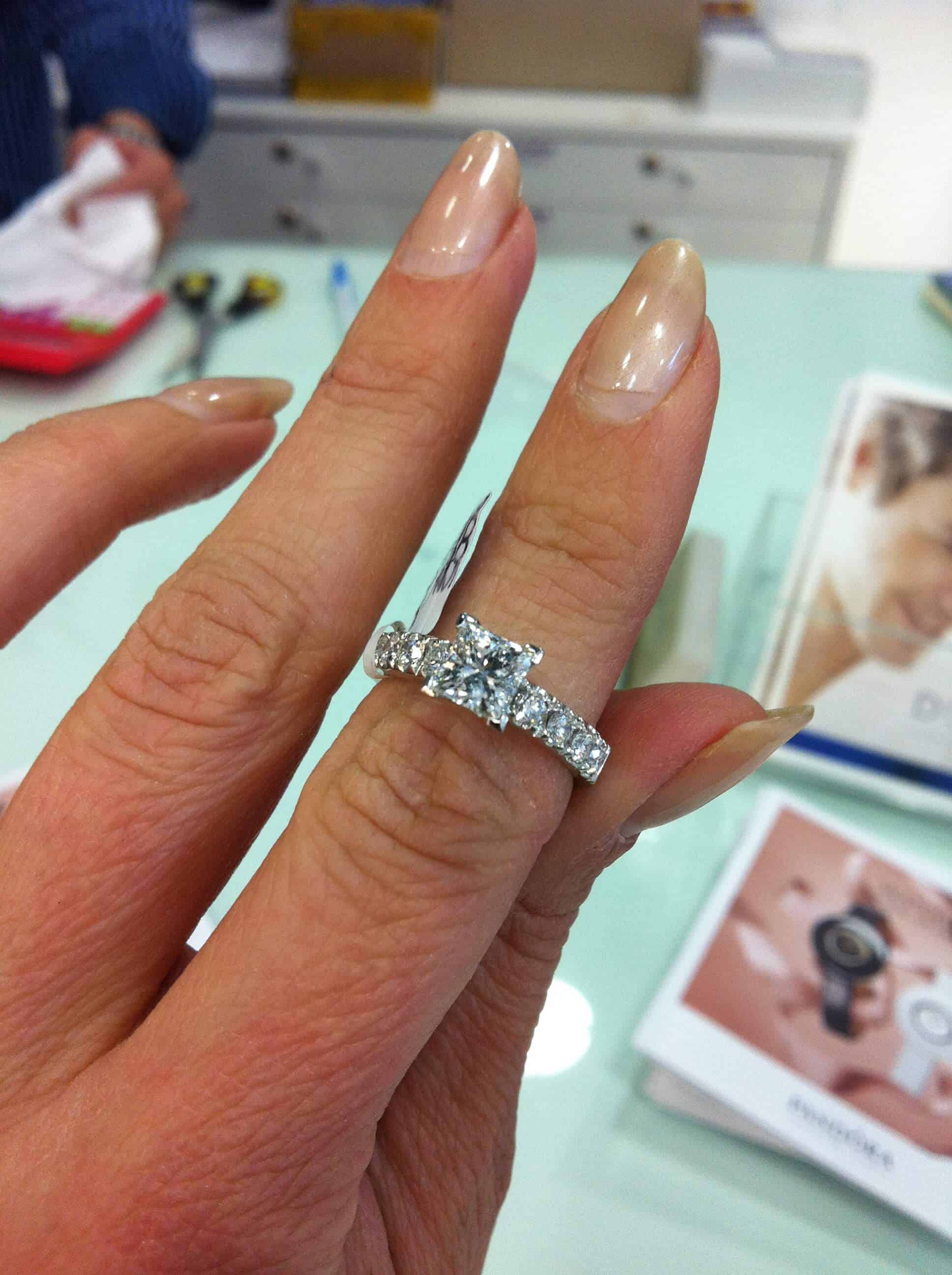 I am searching for a diamond engagement ring. My fiance to be would like a princess cut close to but under 1 carat in size. She also wants brilliant cut diamonds on both shoulders. The exact amount I am not sure, one ring she looked at had 5 diamonds on each shoulder. To me and i might be wrong but its all about symmetry and proportionate sizing to give optimum balance.