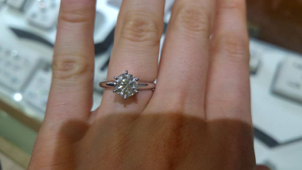 So what did we end up looking at? The diamonds we looked at were, in our opinion, unimpressive to say the least. The first diamond was a 1.42ct “E color, SI2 clarity” round diamond in a white gold setting for $15,950. I put the quality claims in quotes because I seriously doubt that diamond was even close to SI2 (or E color for that matter).
