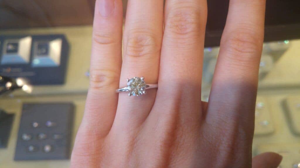 So did Lux Bond & Green’s jewelry live up to the ambiance and service? It did. The first ring we settled on was a 1.77ct J color, VS1 clarity excellent cut round diamond for $16,400. They had it mounted in a platinum solitaire setting that ran another $2,000. The diamond was very beautiful. I loved the proportions, and we did not notice any yellow at all.