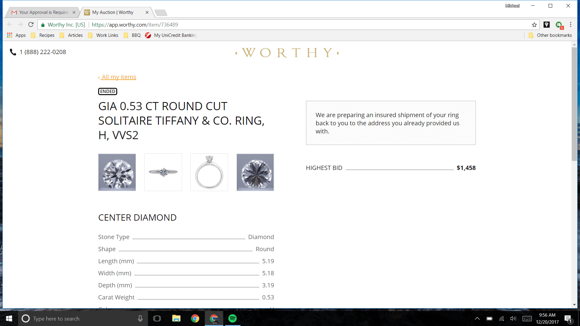 The sales rep for Worthy said they would reach out to some of the bidders (companies that usually purchase Tiffany rings and are willing to pay a premium). A couple of days later he got back to me saying he thought there was a good chance to make that number.