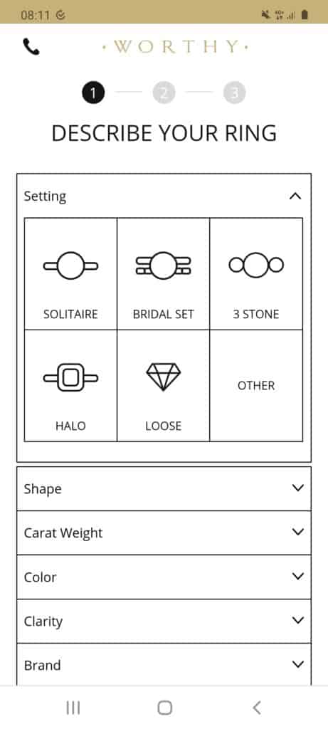 If you are looking to sell your diamond engagement ring, they ask you basic questions about the size, color, clarity and source of the ring. If you are looking to sell other types of jewelry they don’t ask for much more info (which makes sense as there is no way to narrow down all the thousands of types of jewelry into an easy to use filter).