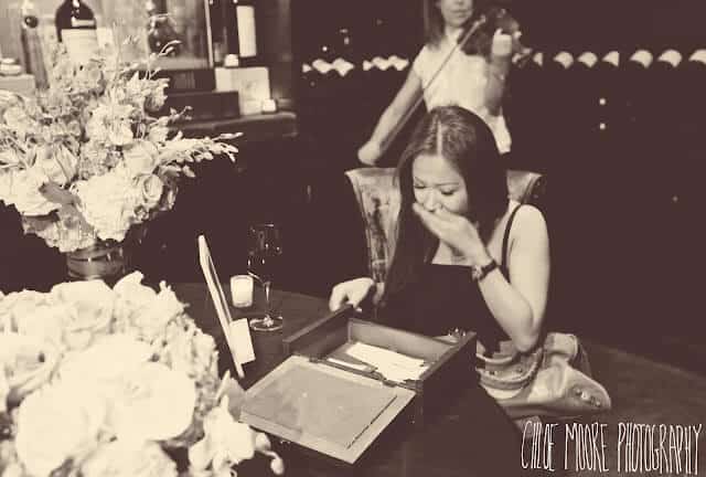 In a moment, you are going to see why proposal photography is so important. Simon called The Heart Bandits from Canada and told us that he wanted to propose to his girlfriend Sandra at a restaurant. But he didn’t want it to be your typical restaurant proposal. He wanted it special, and most importantly, he wanted it to be the ultimate surprise proposal. The Heart Bandits came up with a unique proposal idea and when you see Sandra’s reaction below, you will agree that we hit our mark. Simon and Sandra arrived for dinner at a very swanky restaurant in Beverly Hills. Simon excused himself to the restroom and the waiter delivered a key to Sandra with a note attached. The note instructed Sandra to go upstairs where she would find a box that only that key could open. She was completely blown away when she found a candlelit room decorated with her favorite flowers and a violinist playing romantic music. In the middle of the room was a table with a box in the middle. She sat down at the table and begin reading memories that Simon had put into the box. As she got to the last note, Simon came in and surprised her with a very romantic marriage proposal. Photos are by Chloe Moore Photography.